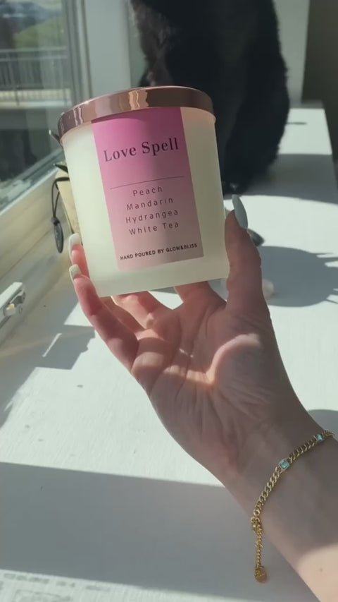 Introducing Love Spell, the perfect candle to set the mood for a romantic evening or create a warm and inviting atmosphere in your home. This candle is made with delightful blend of fruit and floral oils. The top notes of apple, peach, and grapefruit are complemented by the beautiful middle notes of cherry blossom and hydrangea. The base notes of vanilla and powder balance the sweetness of the fragrance, creating a well-rounded and irresistible scent.
